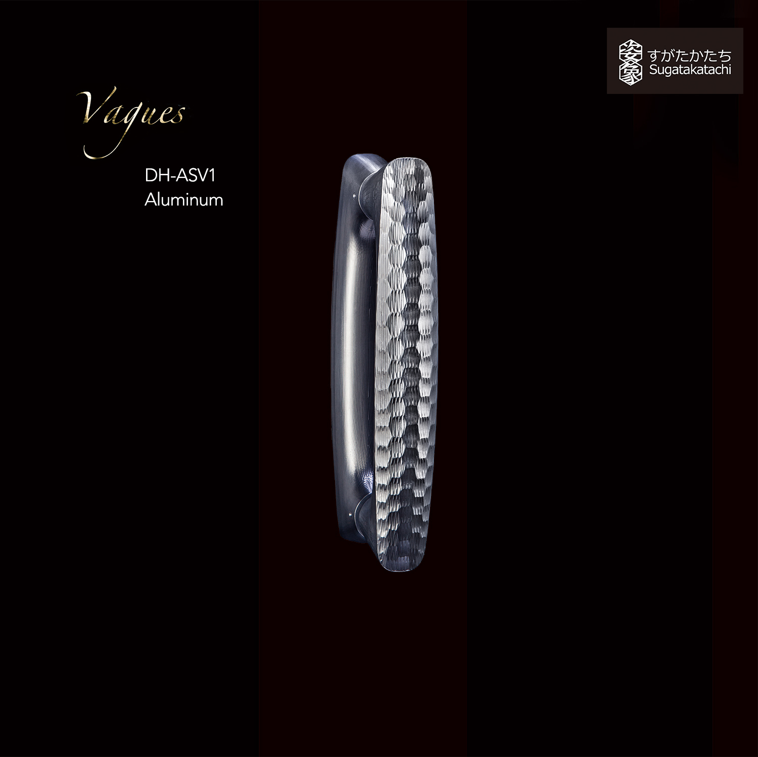 Il y a deux types de poignées de porte : celles en bois et celles sculptées dans l’aluminium. La poignée de porte en bois a des motifs ondulés superposés aux chevauchements du grain du bois à sa surface, lui conférant un aspect de vagues. Les ondulations et les sculptures faites par un outil de précision dans la surface de la poignée en aluminium reflètent la couleur de l’espace venant d'un jeu complexe de réflexion de la lumière. Chacun de ces produits est une oeuvre d’art somptueuse. Ceci représente le commencement de la nouvelle collection SUGATAKATACHI.