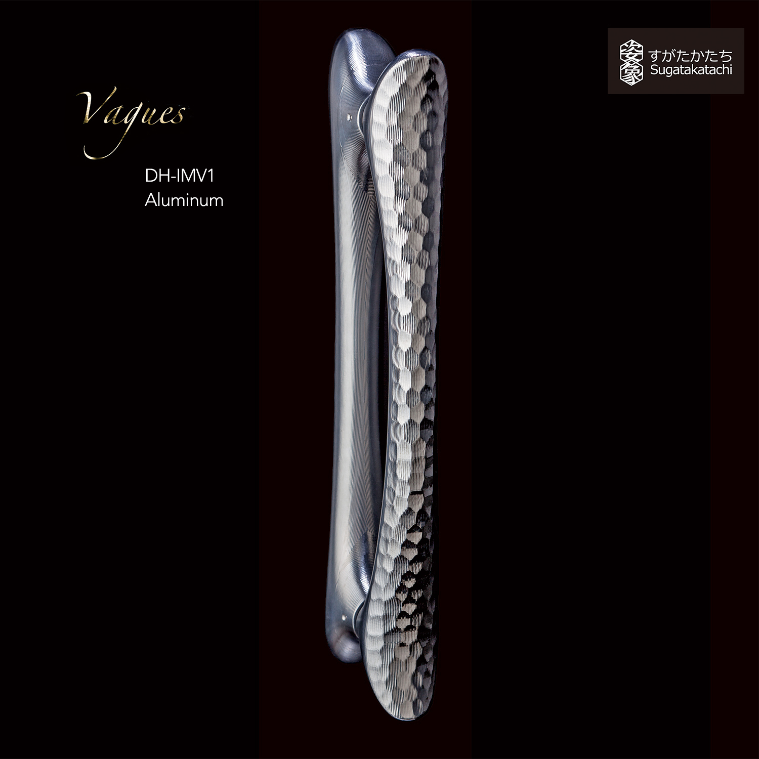 Il y a deux types de poignées de porte : celles en bois et celles sculptées dans l’aluminium. La poignée de porte en bois a des motifs ondulés superposés aux chevauchements du grain du bois à sa surface, lui conférant un aspect de vagues. Les ondulations et les sculptures faites par un outil de précision dans la surface de la poignée en aluminium reflètent la couleur de l’espace venant d'un jeu complexe de réflexion de la lumière. Chacun de ces produits est une oeuvre d’art somptueuse. Ceci représente le commencement de la nouvelle collection SUGATAKATACHI.