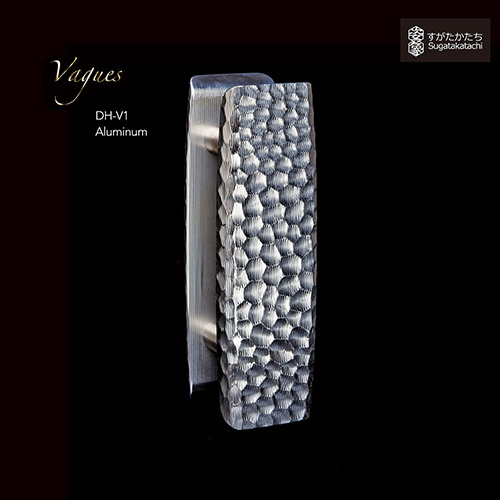 Il y a deux types de poignées de porte : celles en bois et celles sculptées dans l’aluminium. La poignée de porte en bois a des motifs ondulés superposés aux chevauchements du grain du bois à sa surface, lui conférant un aspect de vagues. Les ondulations et les sculptures faites par un outil de précision dans la surface de la poignée en aluminium reflètent la couleur de l’espace venant d'un jeu complexe de réflexion de la lumière. Chacun de ces produits est une oeuvre d’art somptueuse. Ceci représente le commencement de la nouvelle collection SUGATAKATACHI.