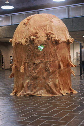 Cette pièce combine des peaux humaines copiées dans de la gomme de latex, avec des images/vidéos et des formes comme l'émergence d'un ver à soie de son contenant. Ce que je vise avec ce travail est une sorte d'autoportrait, mais aussi le portrait du Japon au 20e siècle.