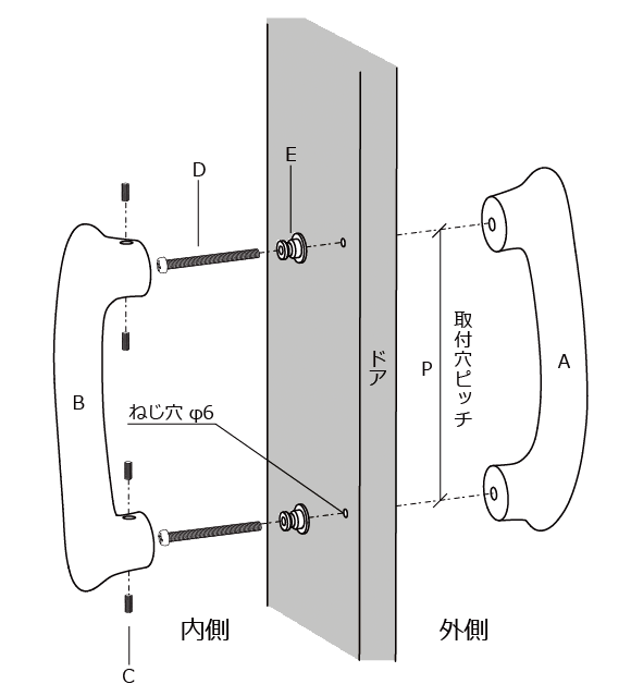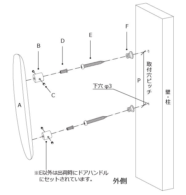 2. 内側からバインドねじ D を取付座金 E とスペーサー F に通し外側ハンドル A をドアに固定する。