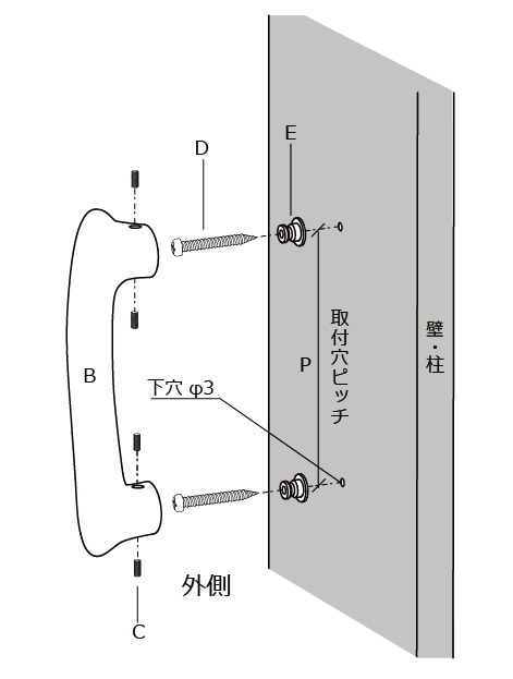 2. タッピングねじ D で取付座金 E を壁・柱に固定する。