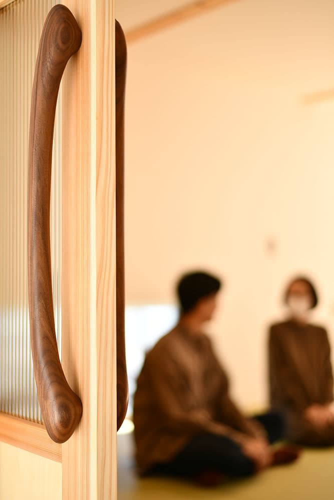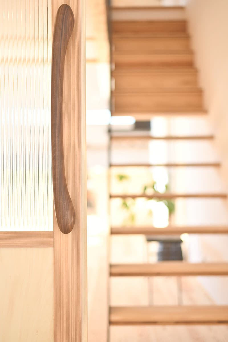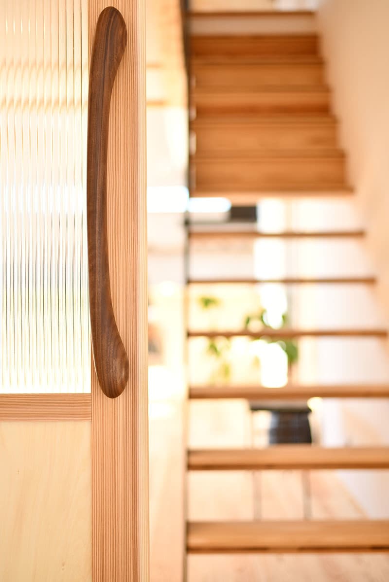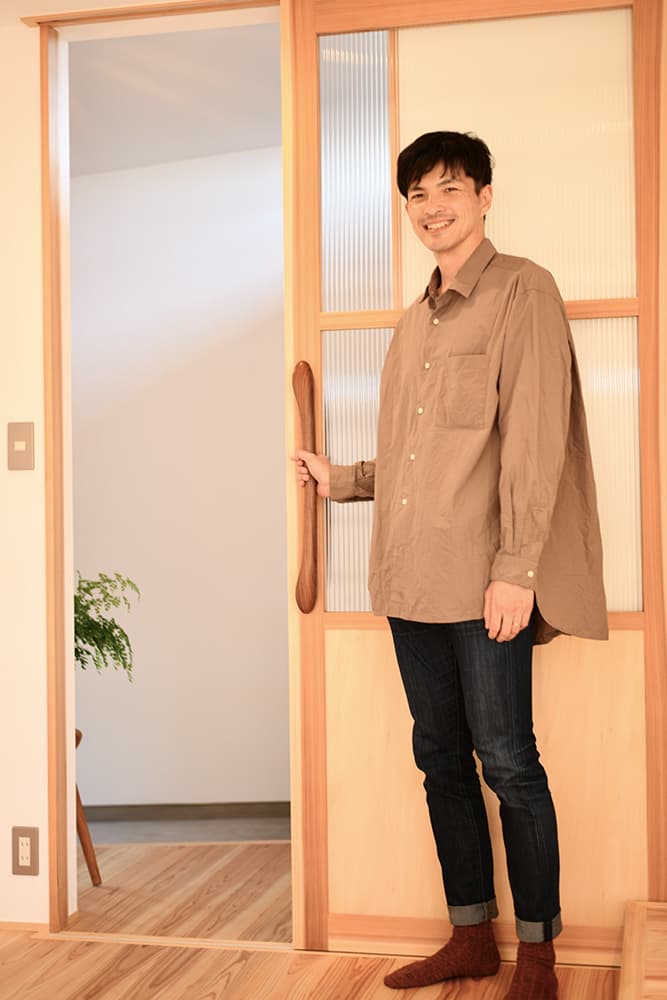2月中旬に訪問したのですが、その時、暖房を入れていないのに部屋全体が暖かいんです。聞くと、ワンランク上の断熱性能HEAT20 G2仕様でバッチリ断熱しているからとのこと。HEAT20 G2とは断熱性能を表す一つの指標で、冬期間室内温度が15℃未満となる割合15%程度、概ね13℃をしたまわらないのだそう。外壁で守られてるから、冬でも晴れの日なら室内ドアは開け放しOKですね。ドア越しのお二人がハッピーで、私たちも嬉しくなりました。暖かな家の暖かいドアハンドル。意匠と性能の両立した住まい。奥様はステンドグラスがご趣味で、換気、水回りが整った専用のお部屋も見せていただきました。これからの新居での生活が楽しみですね!