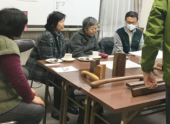 教会の皆様にドアハンドルをご紹介中。(2019年11月旧堂にて)